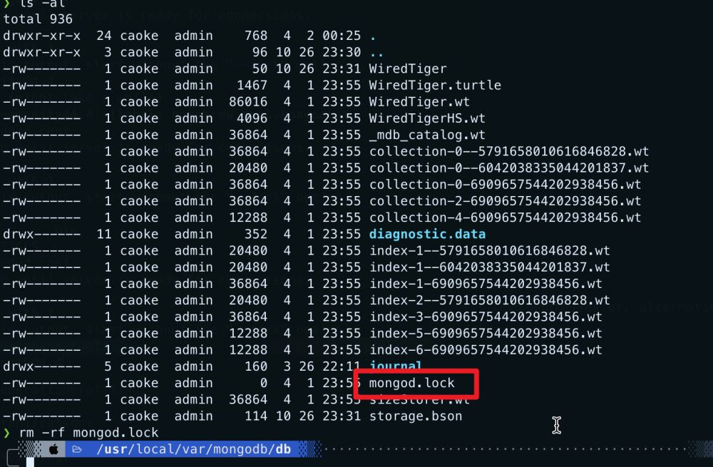 # 这个路径是我的 MongoDB 的安装路径,请根据自己的安装路径进行操作。 cd /usr/local/var/mongodb/db # 删除 "lock 文件" rm -rf mongod.lock