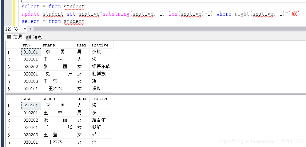 update student set snative=substring(snative, 1, len(snative) - 1) where right(snative, 1)='族';