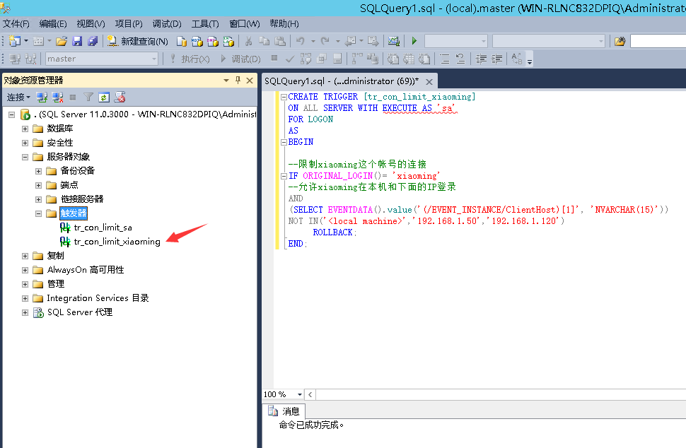在MySql数据库中我们在创建一个新的用户时是可以选择这个用户的可用连接ip的,比如localhost 或者 某个ip 甚至不做限制直接输入 % 则表示这个用户运行任意IP远程连接,但是在微软的MsSqlServer中在创建用户时则没有这样的设置,但是有时候我们处于安全问题,想要限制某个账户只能通过某个IP访问,通过防火墙设置的话会直接阻断这个IP对所有账户的访问,有点一棍子打死,不是我们想要的,这种情况下可以利用MsSqlServer数据库中的触发器来实现这个目的,当用户请求连接数据库时会触发我们提前写好的规则进行验证是否允许连接。