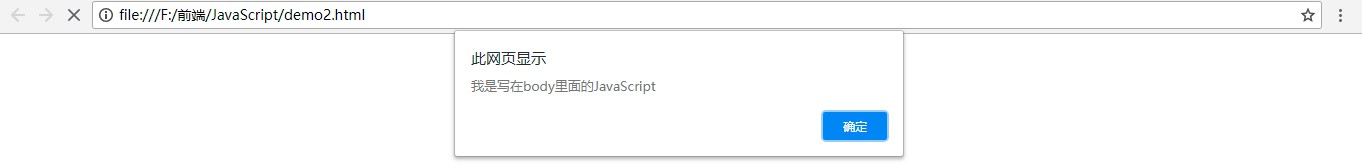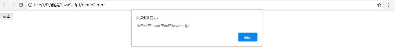 <!DOCTYPE html> <html lang="en"> <head> <meta charset="UTF-8"> <meta name="viewport" content="width=device-width, initial-scale=1.0"> <meta http-equiv="X-UA-Compatible" content="ie=edge"> <title>直接嵌入式</title> <script> function btnClick(){ alert("我是写在head里面的JavaScript"); }; </script> </head> <body> <input type="button" value="点击" onclick="btnClick()" /> <script> alert("我是写在body里面的JavaScript"); </script> </body> </html>