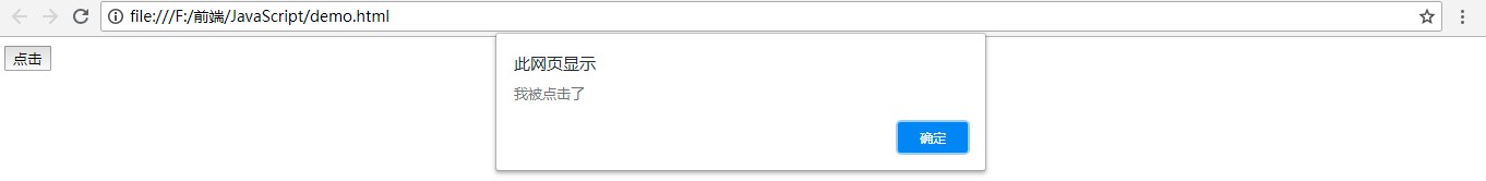 <!DOCTYPE html> <html lang="en"> <head> <meta charset="UTF-8"> <meta name="viewport" content="width=device-width, initial-scale=1.0"> <meta http-equiv="X-UA-Compatible" content="ie=edge"> <title>事件定义式</title> </head> <body> <input type="button" value="点击" onclick="alert('我被点击了')" /> </body> </html>