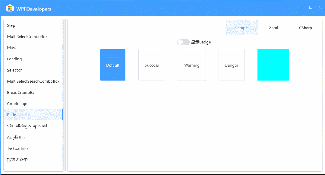 <UserControl x:Class="WPFDevelopers.Samples.ExampleViews.BadgeExample" xmlns="http://schemas.microsoft.com/winfx/2006/xaml/presentation" xmlns:x="http://schemas.microsoft.com/winfx/2006/xaml" xmlns:d="http://schemas.microsoft.com/expression/blend/2008" xmlns:local="clr-namespace:WPFDevelopers.Samples.ExampleViews" xmlns:mc="http://schemas.openxmlformats.org/markup-compatibility/2006" xmlns:wd="https://github.com/WPFDevelopersOrg/WPFDevelopers" d:DesignHeight="450" d:DesignWidth="800" mc:Ignorable="d"> <Grid> <Grid.RowDefinitions> <RowDefinition Height="Auto" /> <RowDefinition Height="Auto" /> </Grid.RowDefinitions> <ToggleButton x:Name="MyBadgeToggleButton" Margin="10" HorizontalAlignment="Center" Content="显示Badge" /> <StackPanel Grid.Row="1" HorizontalAlignment="Center" Orientation="Horizontal"> <Button wd:Badge.IsShow="{Binding ElementName=MyBadgeToggleButton, Path=IsChecked}" wd:Badge.Text="new" Content="Default" Style="{DynamicResource WD.PrimaryButton}" /> <Button Margin="40,0" wd:Badge.FontSize="12" wd:Badge.IsShow="{Binding ElementName=MyBadgeToggleButton, Path=IsChecked}" wd:Badge.Text="3" Content="Success" Style="{DynamicResource WD.SuccessDefaultButton}" /> <Button wd:Badge.FontSize="12" wd:Badge.IsShow="{Binding ElementName=MyBadgeToggleButton, Path=IsChecked}" wd:Badge.Text="10+" Content="Warning" Style="{DynamicResource WD.WarningDefaultButton}" /> <Button Margin="40,0" wd:Badge.IsShow="{Binding ElementName=MyBadgeToggleButton, Path=IsChecked}" wd:Badge.Text="NEW" Content="Danger" Style="{DynamicResource WD.DangerDefaultButton}" /> <Rectangle Width="100" Height="100" wd:Badge.IsShow="{Binding ElementName=MyBadgeToggleButton, Path=IsChecked}" Fill="Aqua" /> </StackPanel> </Grid> </UserControl>