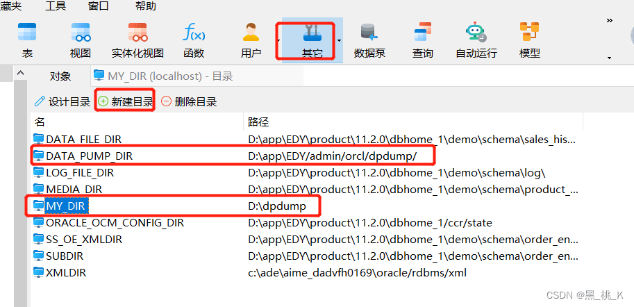 打开navicat 连上本地数据库,点击【其他】-》【目录】,会把你本机的已有的一些目录列表展示出来,我们可以找到oracle 默认的导入dmp文件的目录,DATA_PUMP_DIR,如果不想使用该目录,我们也可以新建目录,这里,我新建一个目录MY_DIR