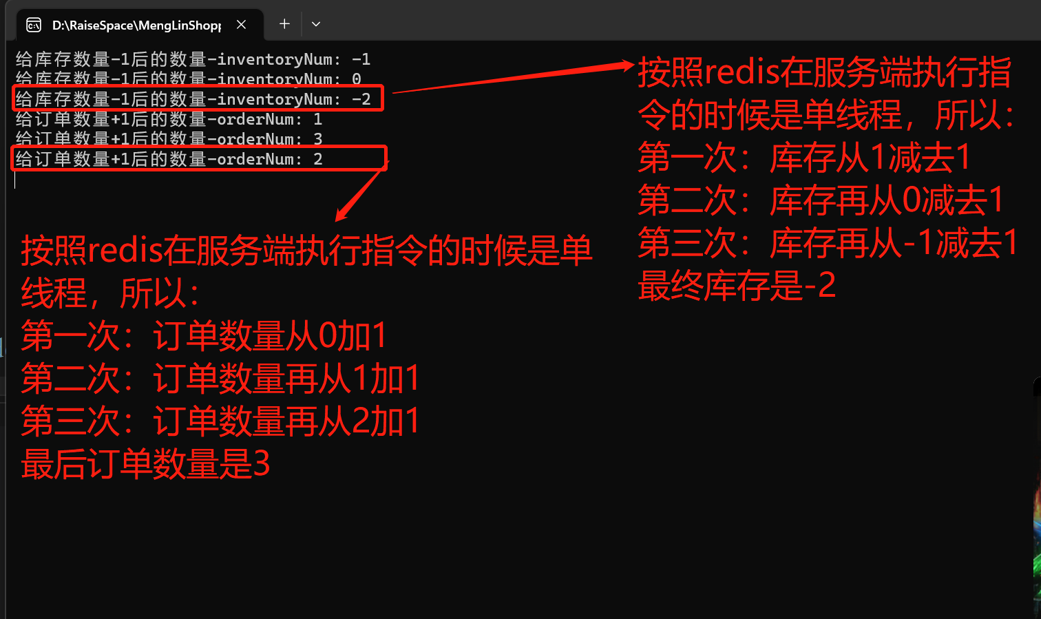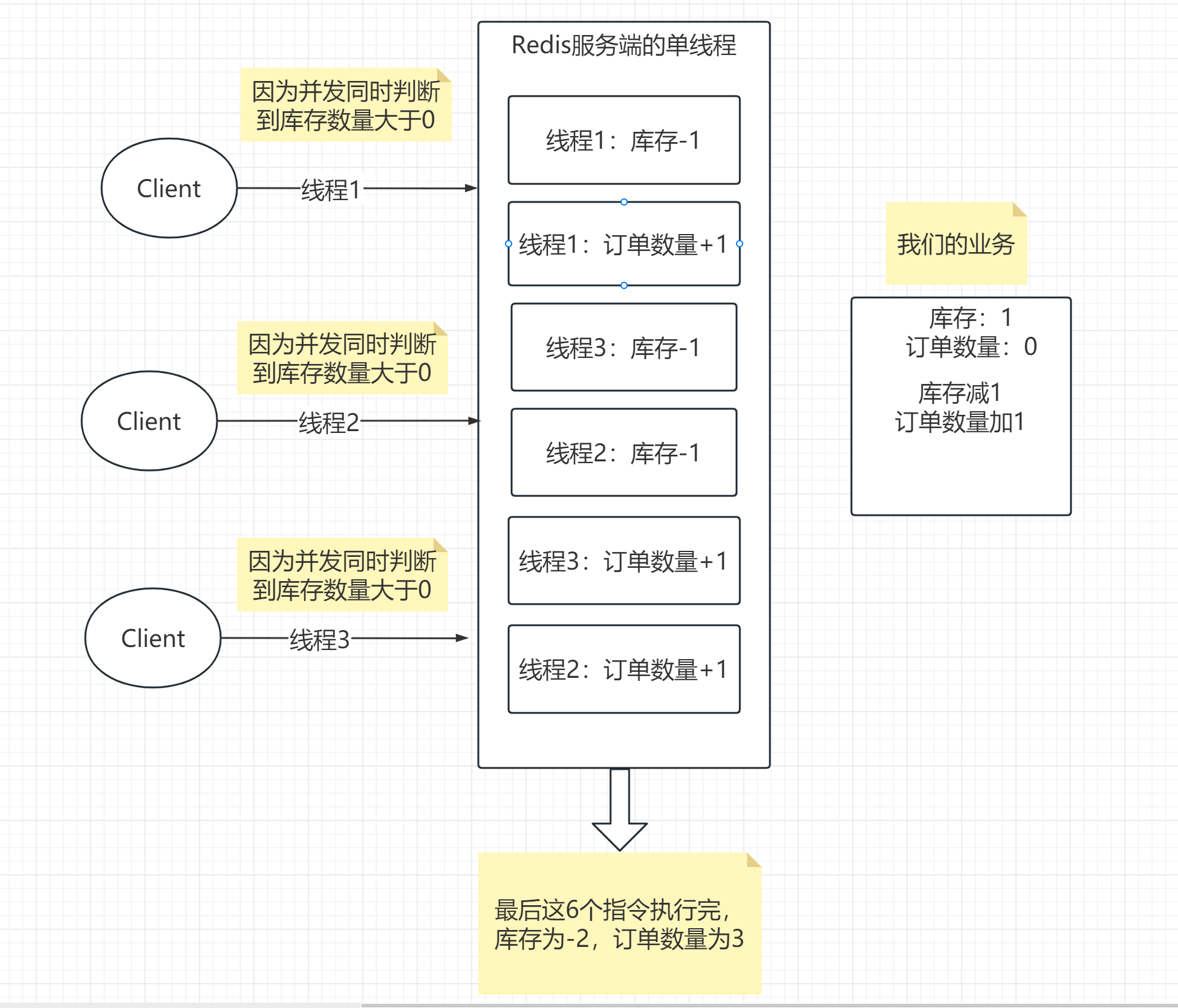 原因:如下图所示,这是因为分别有6个指令(3个库存减1指令,3个订单数量加1指令)在redis服务端执行导致的。