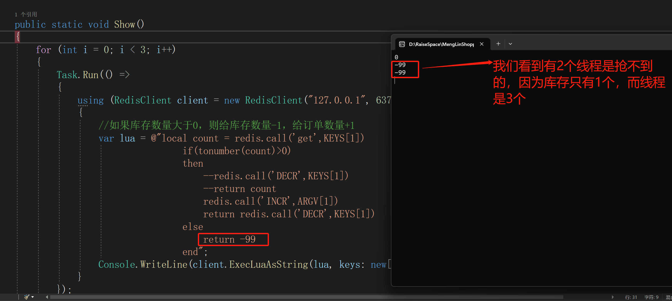 namespace MengLin.Shopping.Redis.LuaScript { public class SecKillLua { /// <summary> /// 使用Lua脚本解决多线程下变卖的问题 /// </summary> static SecKillLua() { using (RedisClient client = new RedisClient("127.0.0.1", 6379)) { //删除当前数据库中的所有Key, 默认删除的是db0 client.FlushDb(); //删除所有数据库中的key client.FlushAll(); //初始化库存数量为1和订单数量为0 client.Set("inventoryNum", 1); client.Set("orderNum", 0); } } public static void Show() { for (int i = 0; i < 3; i++) { Task.Run(() => { using (RedisClient client = new RedisClient("127.0.0.1", 6379)) { //如果库存数量大于0,则给库存数量-1,给订单数量+1 var lua = @"local count = redis.call('get',KEYS[1]) if(tonumber(count)>0) then --return count redis.call('INCR',ARGV[1]) return redis.call('DECR',KEYS[1]) else return -99 end"; Console.WriteLine(client.ExecLuaAsString(lua, keys: new[] { "inventoryNum" }, args: new[] { "orderNum" })); } }); } } } }