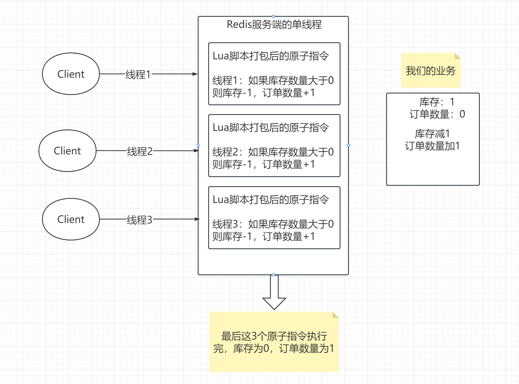 是因为Lua脚本把3个指令,分别是:判断库存数量是否大于0、库存减1、订单数量加1,这3个指令打包放在一起执行了且不能分割,相当于组装成了原子指令,所以避免了超卖问题。