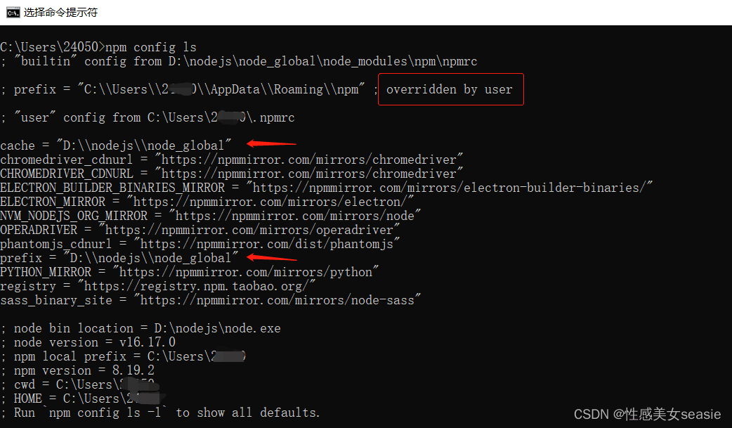 如果报错了,请看标题:新建存放位置的前提!设置成功后(就是没有报错提示),输入:npm config ls