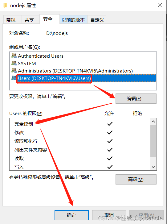 前提是 nodejs 文件夹必须有完全控制的权限。不然等会 npm install 会报错:could not create logs-dir: Error: EPERM: operation not permitted, mkdir。设置方法如下: