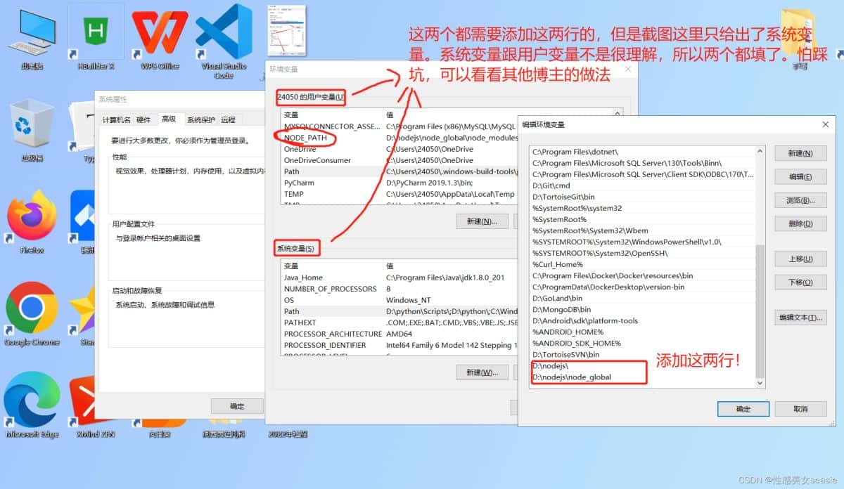 - 在【用户变量】【系统变量】的 Path 添加两行:D:\nodejs、D:\nodejs\node_global