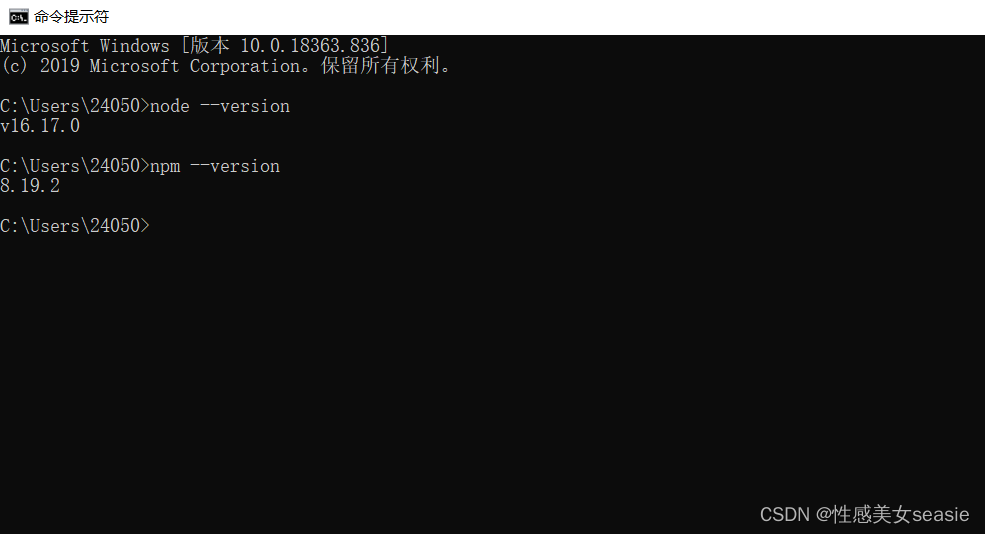 点击安装,安装成功之后,检查一下,打开cmd,输入:node --version、npm --version