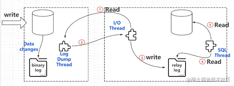 当MySQL数据库发生写操作的时候会记录下binlog,它是一种逻辑日志。有了这个 binlog,从服务器会获取主服务器的 binlog 文件,然后解析里面的 SQL 语句,在从服务器上面执行一遍,保持主从的数据一致。