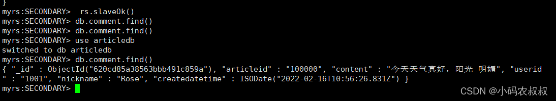 执行完毕后,再次查询即可看到主节点上插入的数据了