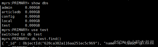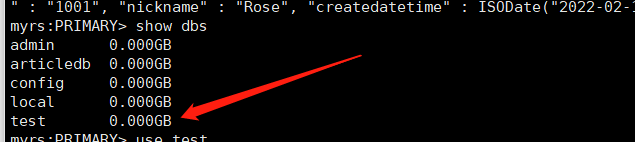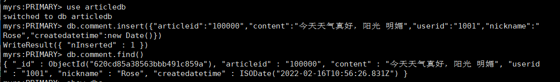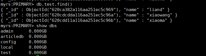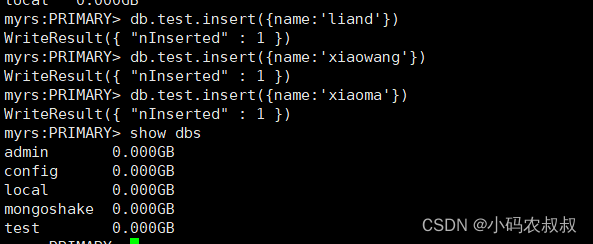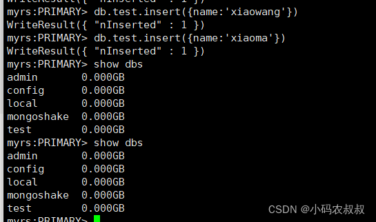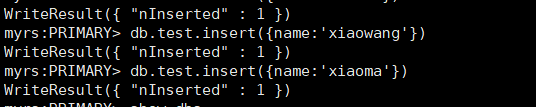 在上一步的窗口下,即主节点上,给某个库的某个集合下插入一条数据