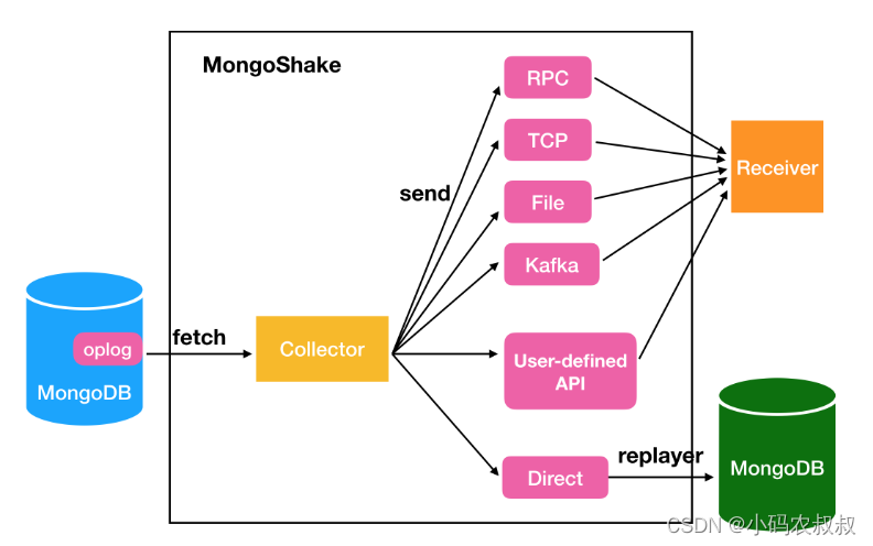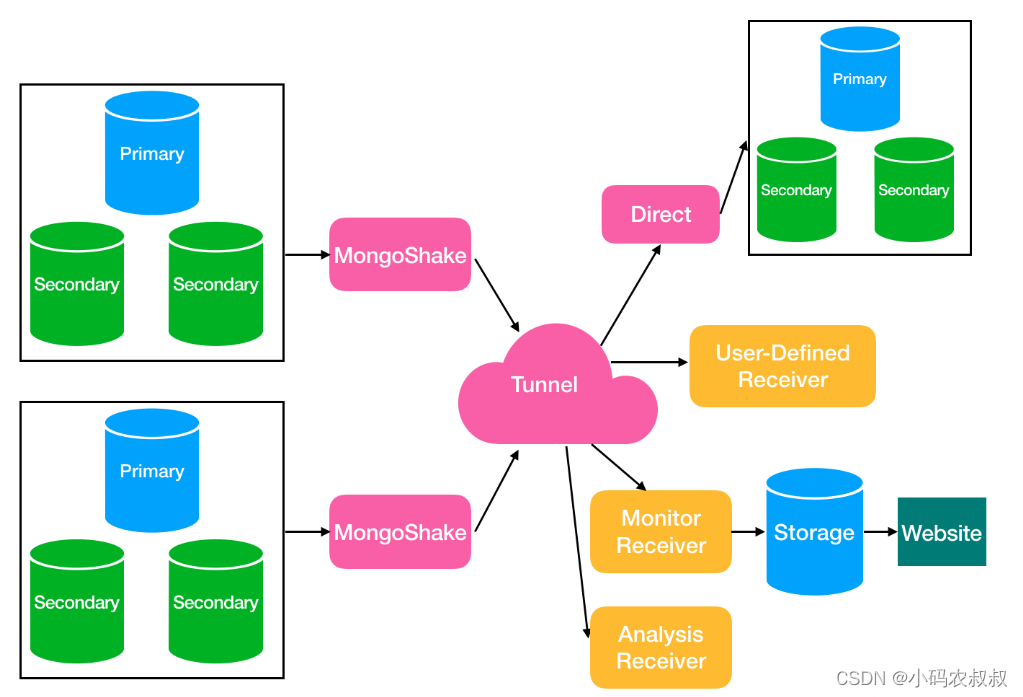 有了上面的两个复制集群,mongoshake的使用就变得非常简单了,mongoshake实现数据同步的基本原理是通过监听mongodb的oplog,解析其中的事件,从而完成数据的读取与写入