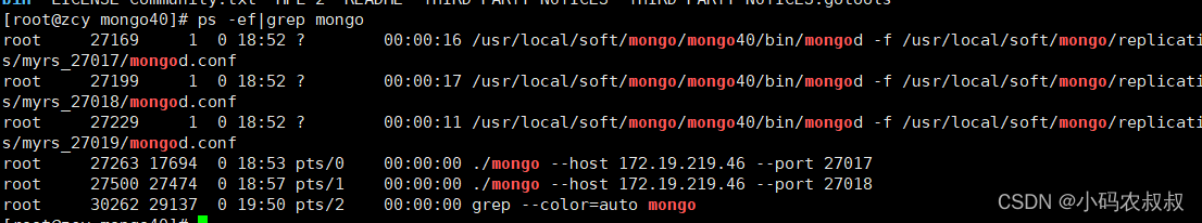 在另外的myrs_27018 ,myrs_27019两个目录下做同样的操作,只需要分别修改下配置文件中的端口号即可