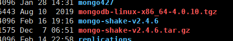 - 提前下载mongodb以及mongoshake安装包,两台服务器均上传,本次mongodb版本为:mongodb-linux-x86_64-4.0.10.tgz,mongo-shake-v2.4.6.tar.gz