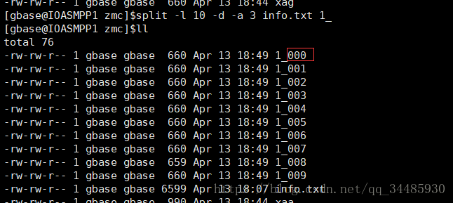 可以看到-l把每个文件切成10行文件的后缀不是aa变成了000这是-d的效果,用数子后缀,-a 3是后缀3个,如果-a 4 后缀就变成了0000