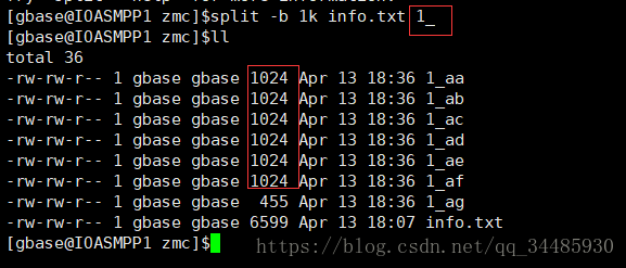 按文件大小切分 每个1K(也可以选择‘M’‘G’‘T’等)执行split -b 1k info.txt 结果如下,每个文件被均分为1K
