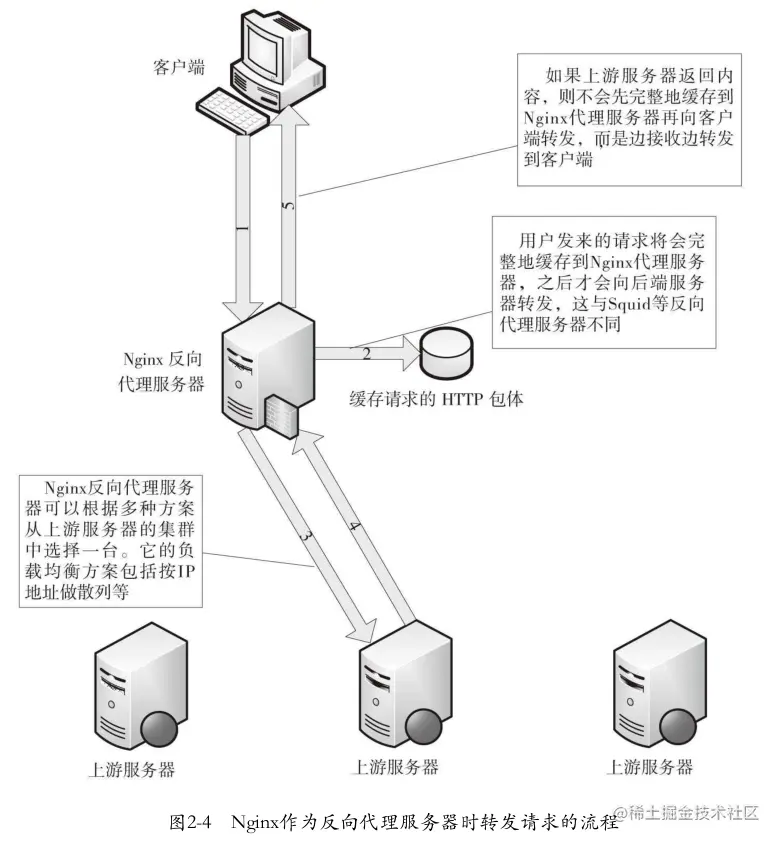 Nginx的反向代理,当用户发送一个HTTP请求时,Nginx不会立刻转发到上游服务器,而是先把用户的请求(包括HTTP包体)完整地接收到Nginx所在的服务器的磁盘或内存中,然后再向上游服务器发起连接,把缓存的客户端请求转发到上游服务器。