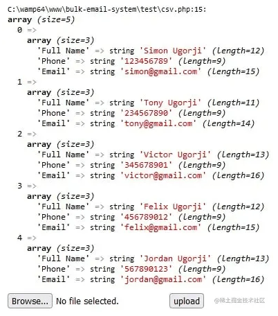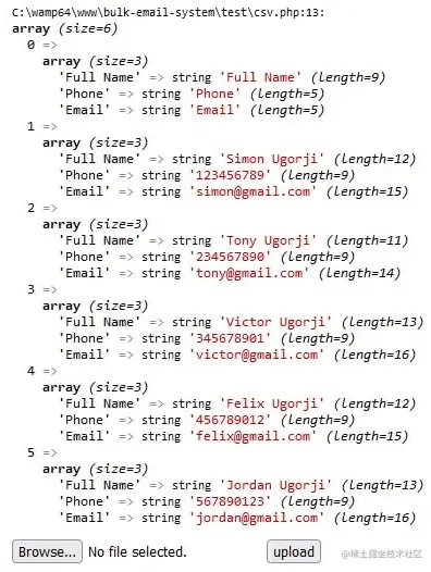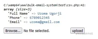 我们使用 array_walk() 函数遍历此数组 ,然后提供一个回调函数,它将列标题(全名、QQ、电子邮件)和每个 CSV 数据组合为一个新数组。