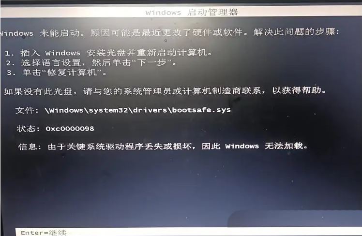 电脑黑屏,只显示Windows 未能启动,文件bootsafe.sys错误,状态0xc0000098,这是有使用Win10系统用户遇到的问题,不知道怎么办,这篇文章是本站在不重装系统的情况下给大家带来的解决方法。