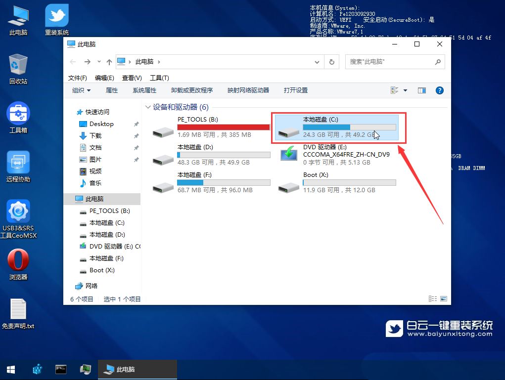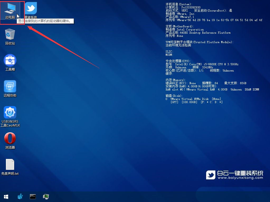 4、双击打开白云PE系统桌面上的【此电脑】;