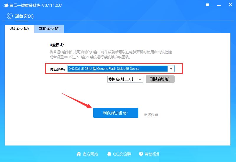 4、U盘模式:将普通U盘制作成可启动的U盘,制作成功后可以在电脑开机时使用启动快捷键或者设置BIOS进入U盘PE系统进行系统维护或重装。选择设备这里选择【U盘】,再点击【制作启动U盘】;