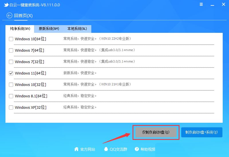 6、如果已经准备好系统,可以直接点击【仅制作启动U盘】,如果没有系统,可以勾选需要安装的系统(支持选择纯净系统或原版系统),再点击【制作启动U盘+系统】;