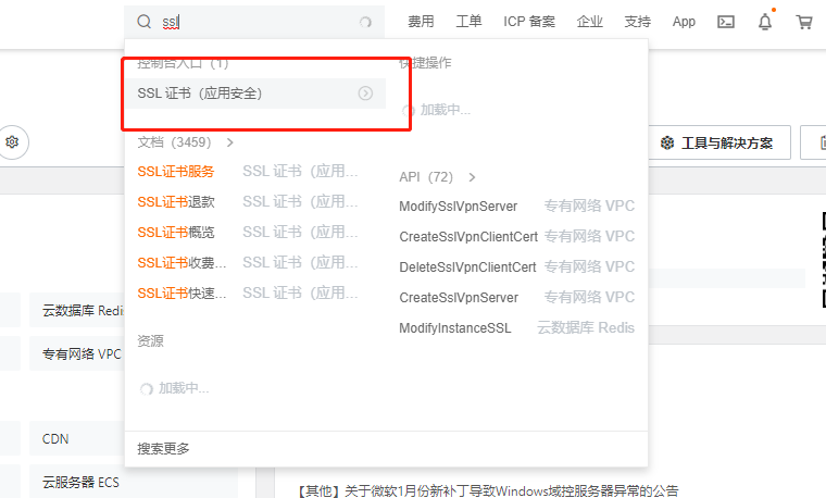 我就以我最常用的ssl证书为例,先登录阿里云,进入控制台搜索ssl