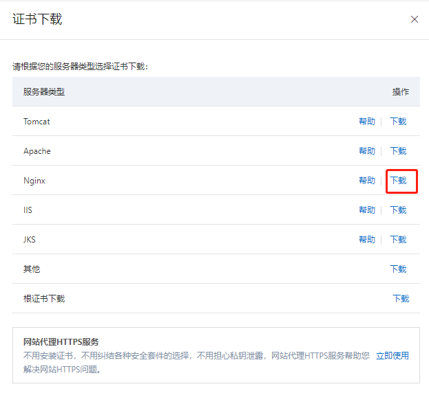 我这里是以Nginx作为反向代理,下载的证书类型是Nginx,所以前提是你的网站已经使用了Nginx