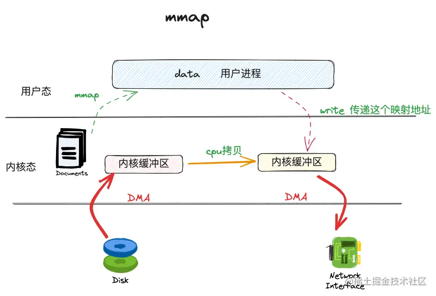 注意整个过程,我们是没有将文件内容读取到用户空间的任何缓冲区的。我们仅仅是在write系统调用时,告诉了内核一个地址(即字节数组的地址),而这个地址被mmap映射成了文件的地址。示意图如下: