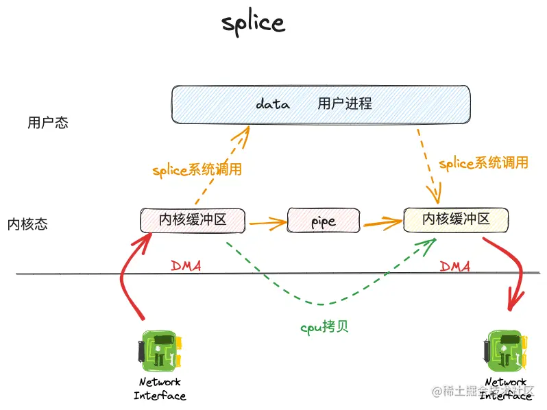 splice系统调用则是为了解决源文件描述符和目的文件描述符都是socket的情况而产生的。splice系统调用的原理是通过管道让数据在源socket和目的socket之间进行传输。示意图如下: