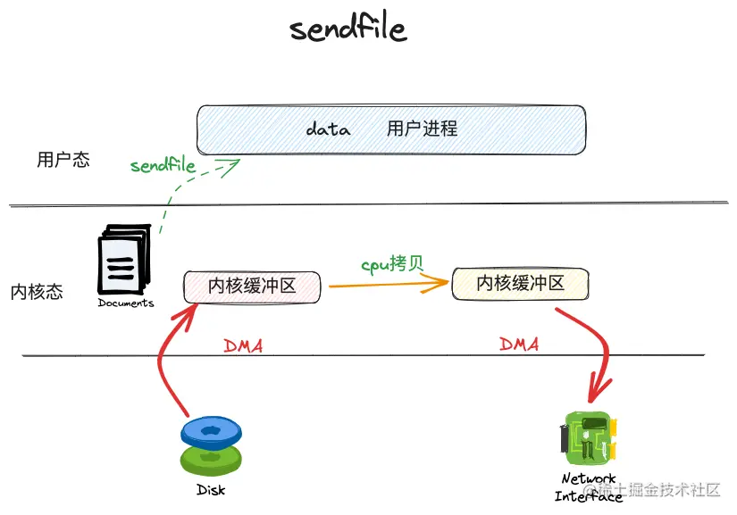 Sendfile的系统调用可以将目的文件描述符和源文件描述符传递进去,剩下的拷贝过程就交给内核了。示意图如下:
