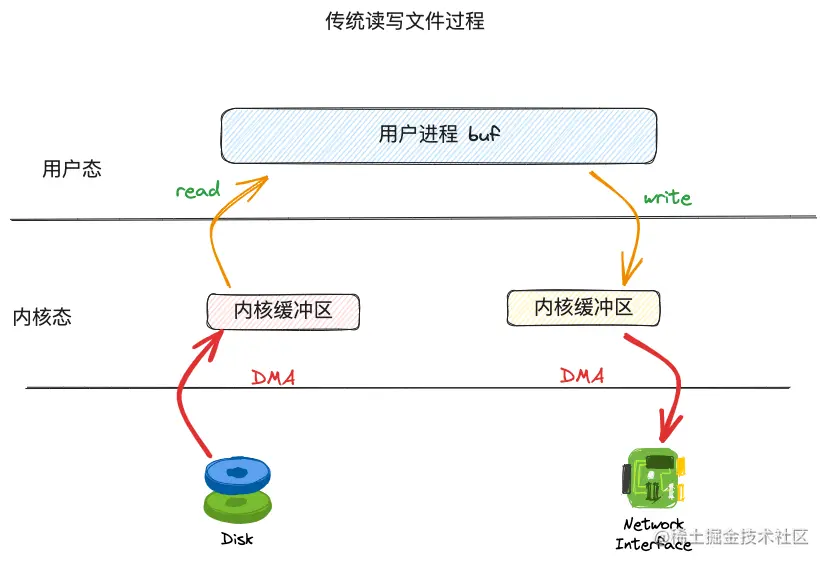 整个过程需要经过read和write两次系统调用,而每次read和write的调用将面临用户态和内核态缓冲区之间数据的拷贝。