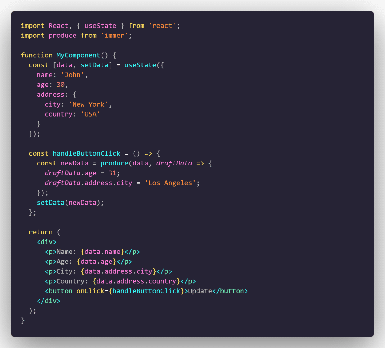 请注意,我们在handleButtonClick方法中使用了produce方法来创建新的状态对象。produce方法将原始状态对象data作为第一个参数,并接受一个回调函数作为第二个参数。在回调函数中,我们可以使用类似于修改原始状态对象的方式来修改draftData对象,但实际上我们是在修改新的状态对象。最后,produce方法将返回一个新的状态对象newData,该对象包含所有更改。