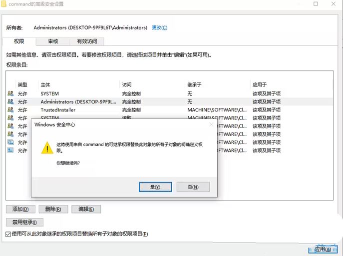 11、返回到这界面,可以看到权限为完全控制了,没修改前是读取,点【应用 】会提示替换继承权,点【是 】即可;