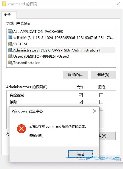 4、Windows 安全中心提示:无法保存对其权限所作的更改,拒绝访问;