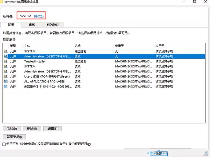 如果当前电脑系统是Win10家庭版或学生版,可能没有权限编辑系统的继承权限。