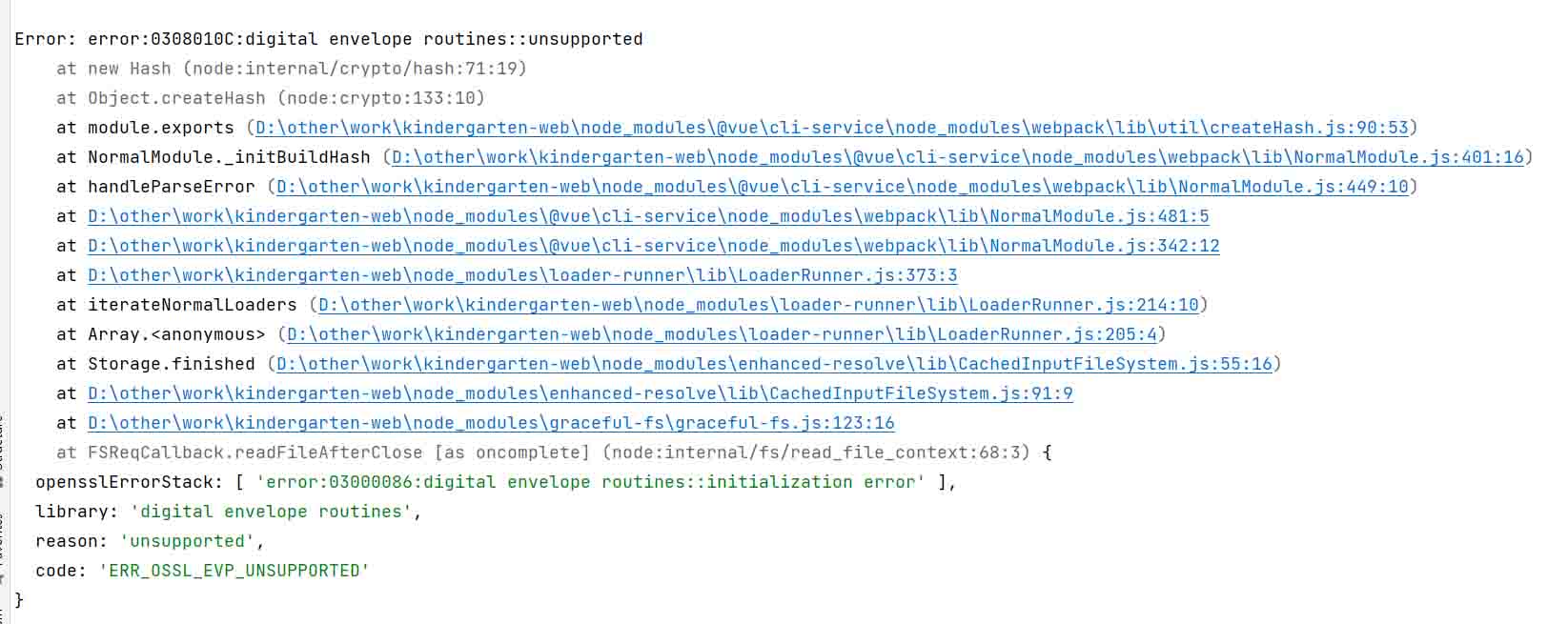 错误原因:node.js版本大于等于17时使用了OpenSSL3.0,其对允许算法和密钥大小增加了严格的限制