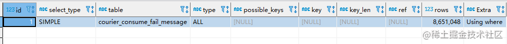 在我们的生产环境中有一张表:courier_consume_fail_message,是存放消息消费失败的数据的,设计之初,这张表的数据量评估在万级别以下,因此没有建立索引。
