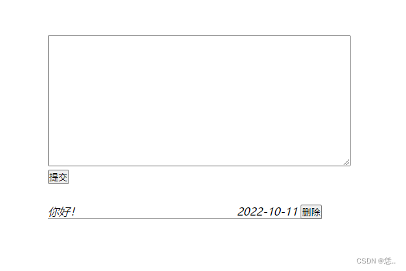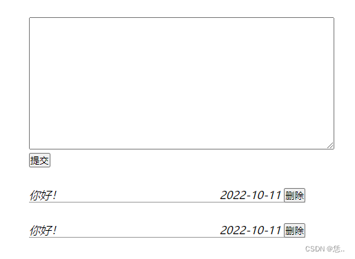 要求在页面文本框中输入一些文字之后,点击“提交”按钮,就可以让输入的文字和当前留言时间显示在下面,重新输入一些文字,再点击提交,就可以让新发布的内容显示在最上面。点击后面的删除,就可以删除已经提交后的留言。