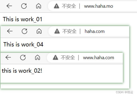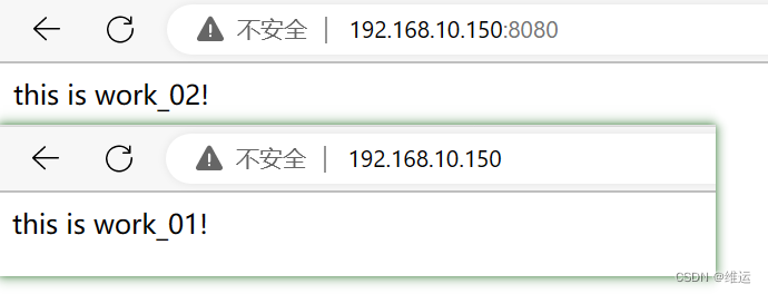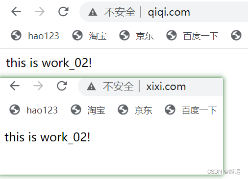 #两个不同文件夹,分别存放不同文件 [root@nginx ~]# mkdir /www/work_01 -p [root@nginx ~]# mkdir /www/work_02 [root@nginx ~]# vim /www/work_01/index.html this is work_01! [root@nginx ~]# vim /www/work_02/index.html this is work_02!