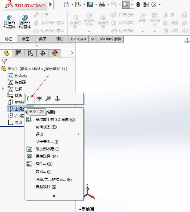 打开Solidworks界面,右键单击左侧的“上视基准面”,在弹出来的下拉菜单中,选择草图绘制,如图: