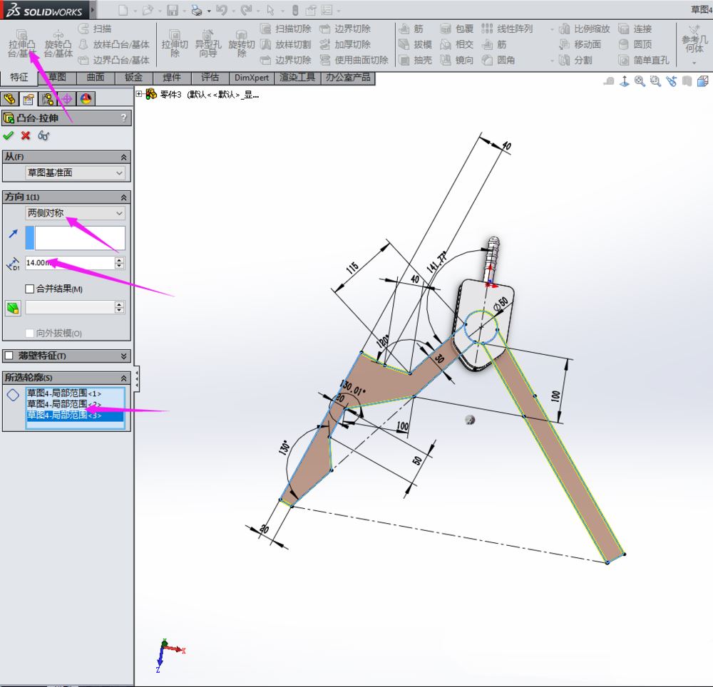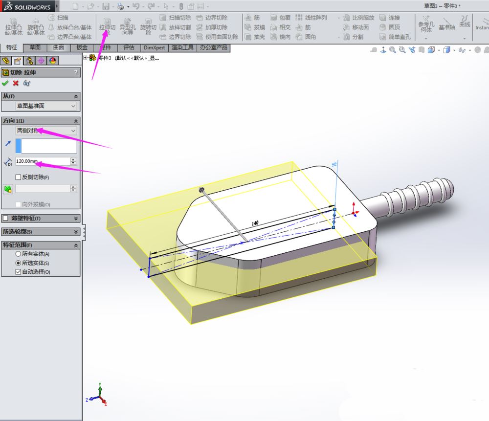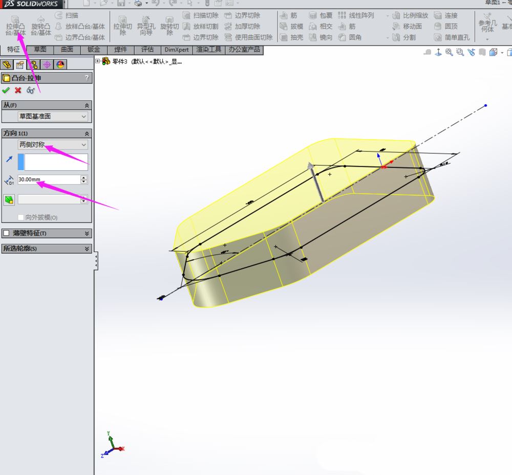 草图绘制好后,在“特征”里单击“拉伸”,在出现的设置里面输入参数,如图: