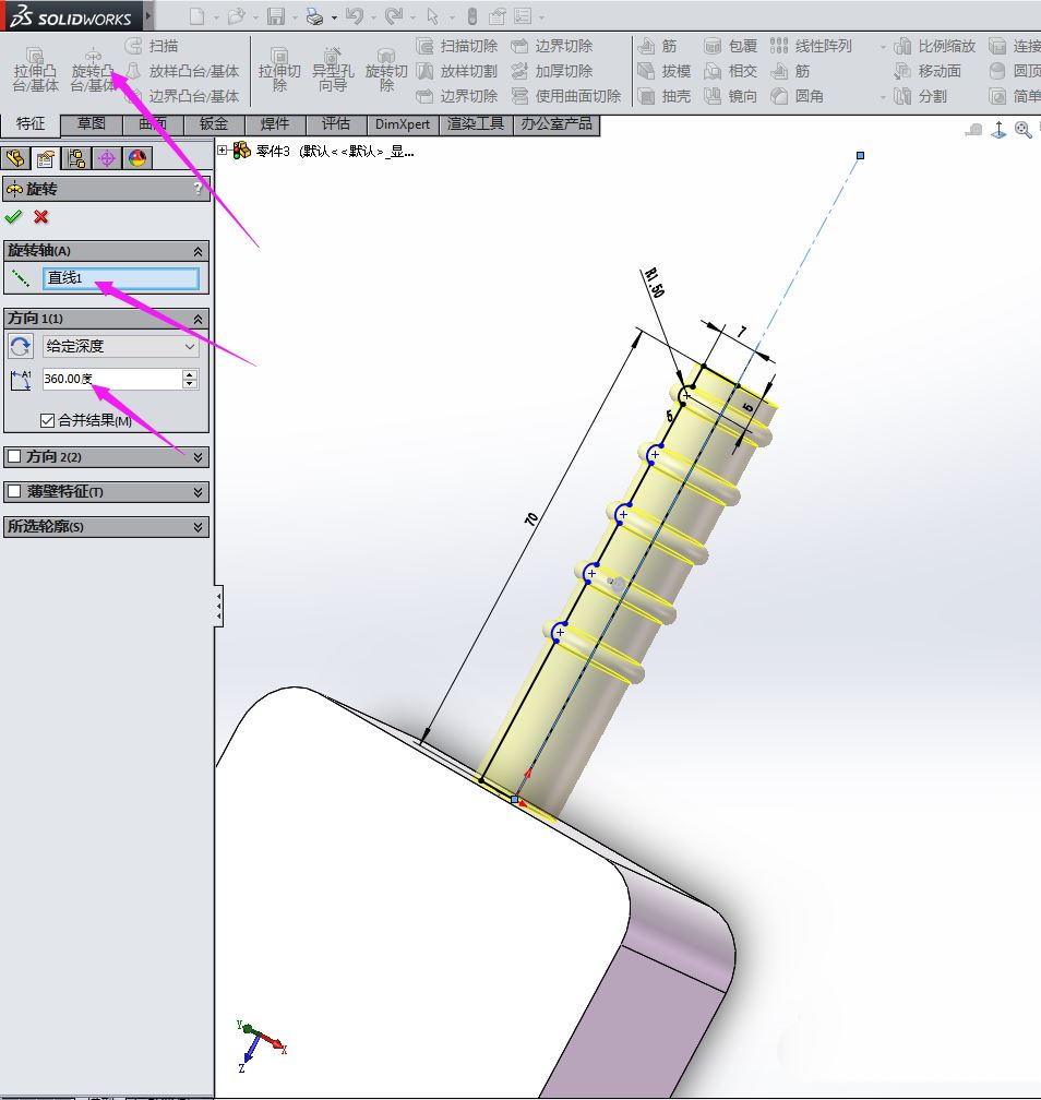 键单击左侧的“上视基准面”,画出草图后,在“特征”里单击“旋转”,在出现的设置里面输入参数,如图: