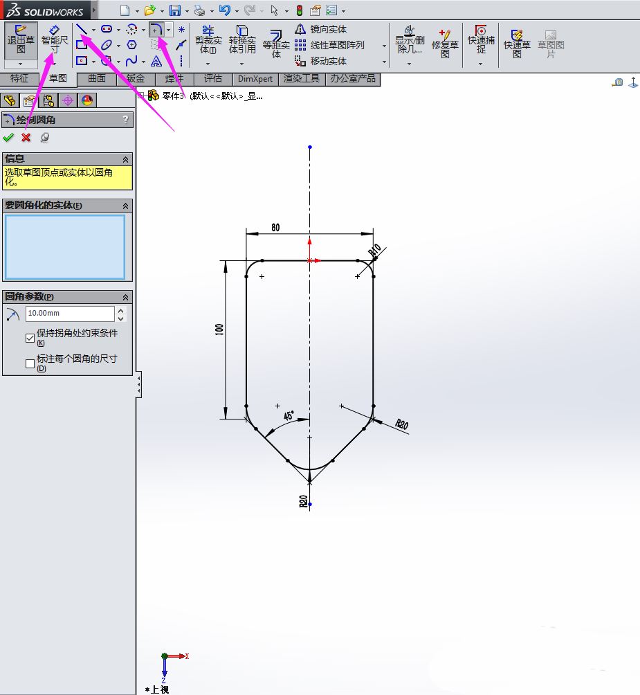 在草图绘制界面,我们用草图绘制出下图所示的图形,并用智能尺寸标注好尺寸,使图形完全定义。
