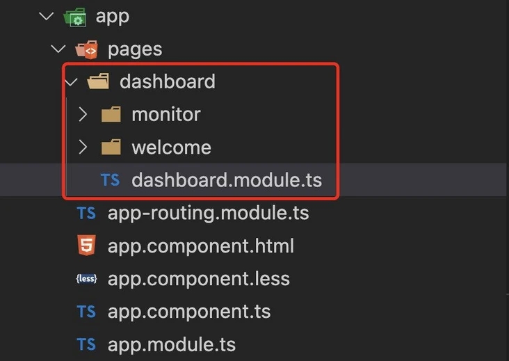 上图中 dashboard 作为一个模块,其下有两个页面,分别是 monitor 和 welcome