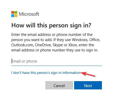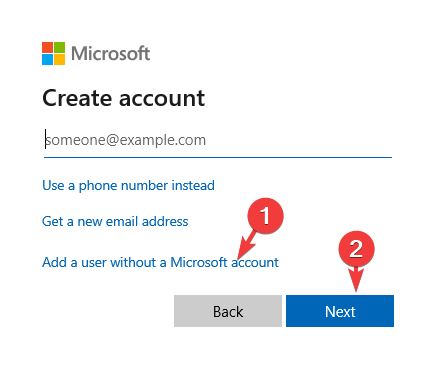 在创建帐户窗口中,单击添加没有 Microsoft 帐户的用户,然后单击下一步。
