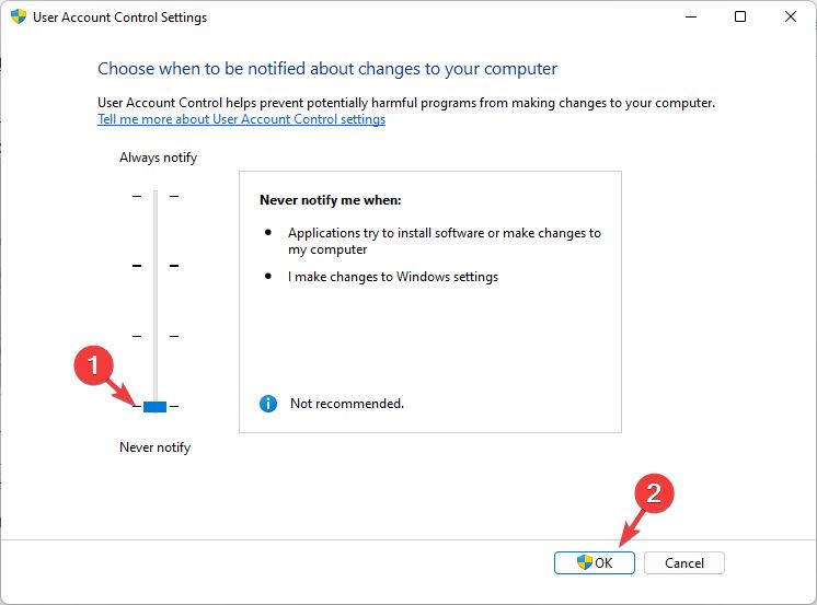 当用户帐户控制设置窗口打开时,将其设置为从不通知。