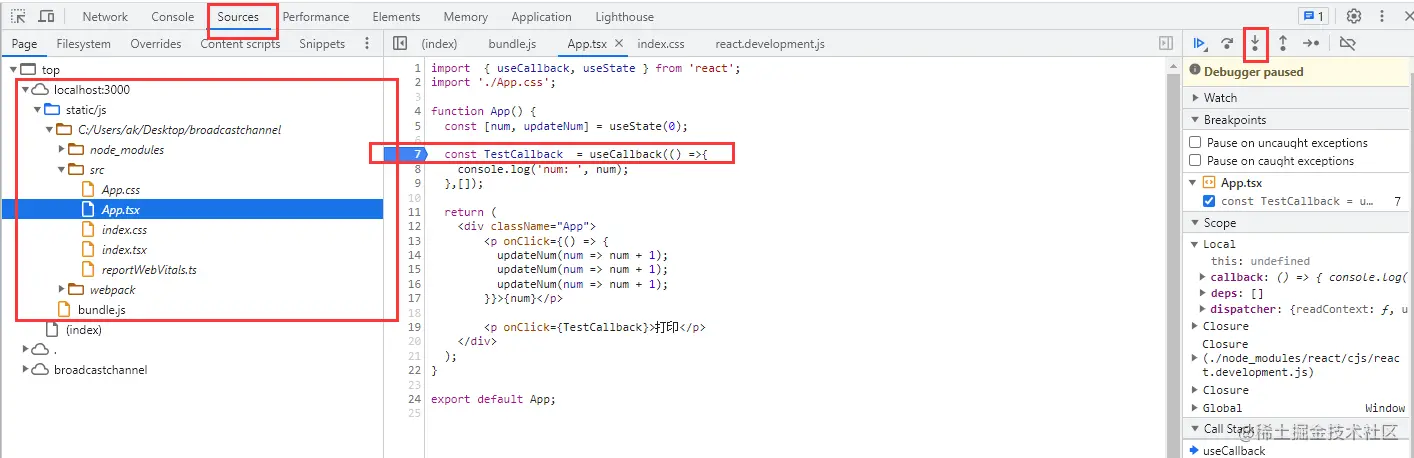 export default App;在浏览器的source设置断点,熟悉一遍useCallback的调用流程。(由于.gif过大,这里就不上git了,自行调试)